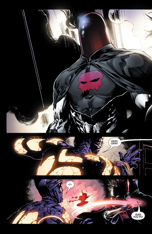 The meeting however is brought to an abrupt halt when Red Hood and Scarlet arrive. Quietly making their way into the room like two ghosts, the team takes very little time in announcing their presence. Brandishing two shiny ruby red pistols and a crimson skull emblazoned across his chest, the Red Hood makes quick work of the skells sitting around the table, leaving only Penguin conscious to receive his message. "Let the punishment fit the crime."