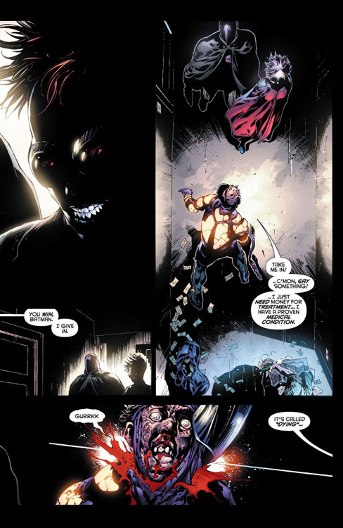 But something is still deeply troubling Sasha. Pyg's mask is still affixed to her face and won't seem to come off. Though somehow the mask failed to brain-wash her like the rest of Pyg's Dollotrons she still murdered her own father and she worries that there might be future side-effects. She dreams of the day when the mask might somehow dry up and crumble off, giving her back her own beautiful identity. But Red Hood assuages all her doubts and quiets all her fears. Taking her in his hands he reminds her that her ghastly appearance is after all good for the publicity.