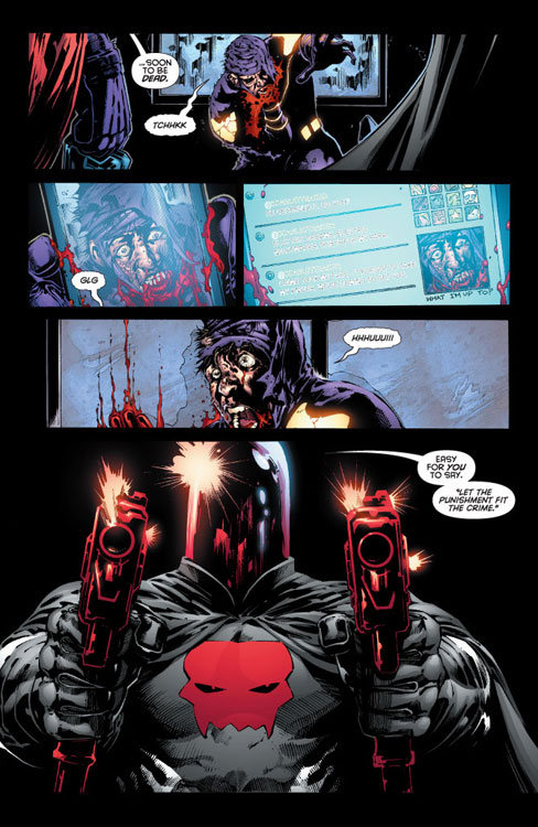 Against His Red Right Hand." But not only are they deadly they're also media savvy. The Red Hood spends almost as much time carefully crafting their press-release as they did executing the Lightning Bug. Sasha micro-blogs their escapades on her social media profile, uploading a picture of the dying Bug with a caption that reads, "Crime took my face - it forgot to take my knives. We're coming for you."