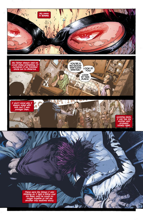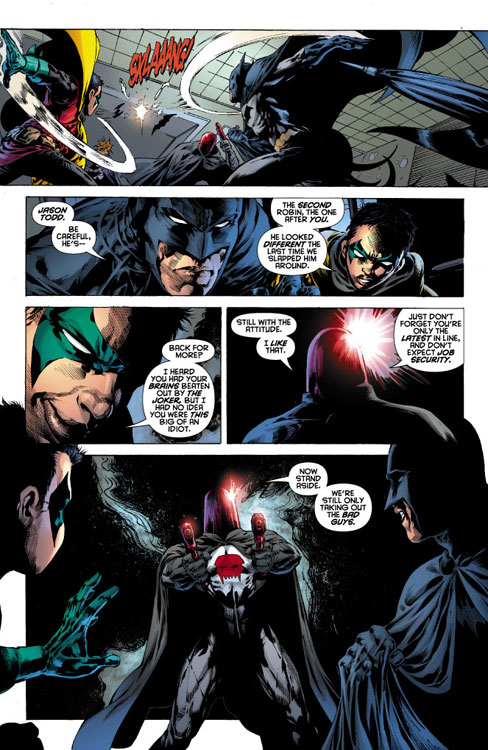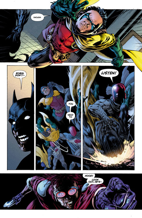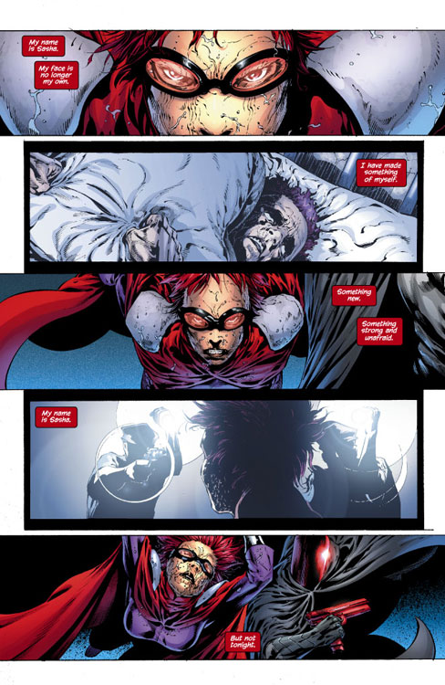 Though they save the mouth-piece's life, the battle between the Duos quickly turns ugly. Sasha has not forgotten the face of the Boy Wonder who failed to save her like he promised he would back at Professor Pyg's circus of horrors. And she takes this opportunity to make the most out of this little reunion - shanking Robin with one of her razor sharp knives! Distracted, Batman calls out to his partner but this only allows the Red Hood to get the upper hand, knocking him