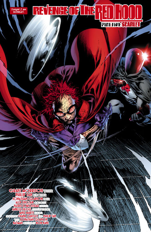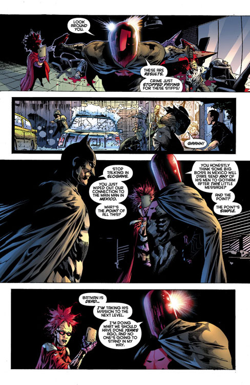 Assassins. And now Death itself has come to Gotham... looking for the Red Hood! Soon after learning about Flamingo's arrival Batman rushes to find Jason before Flamingo can. By the time he and Damian locate Hood and Scarlet they're pouring bleach into the IV of the only other surviving member of Penguin's criminal meeting of the minds, a mouthpiece by the name of Mr. Santo.