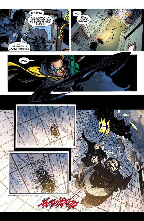 squawking bird man takes off, diving out of a window, seemingly forgetting that penguins cannot fly. Thankfully Robin's batline is able to slow his fall and ease his impact. But unfortunately that's all the media sees. Batman and Robin shielding a known criminal from Gotham's Underground.