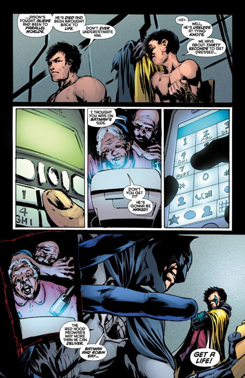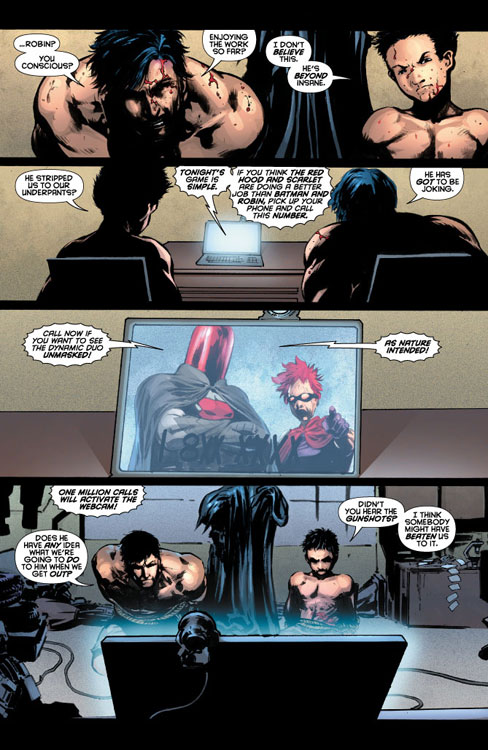 Elsewhere across Gotham City citizens are racing to their own phone lines to dial Jason Todd's 1-800 number. The Red Hood has taken to the airwaves advertising that should one million Gothamites call his number a webcam will activate and show the world the captive Dynamic Duo, disrobed and unmasked for all to see! Of course even though Jason Todd may have returned from the dead, traveled different worlds and battled unknown aliens, his knot tying skills leave a lot to be desired. Batman and Robin are able to slip out of their restraints and back into their costumes before the camera can activate. All across Gotham, people are sighing a mixture of disappointment and relief that their masked heroes remain anonymous for one more day.