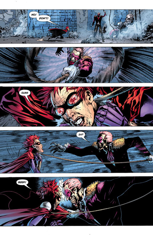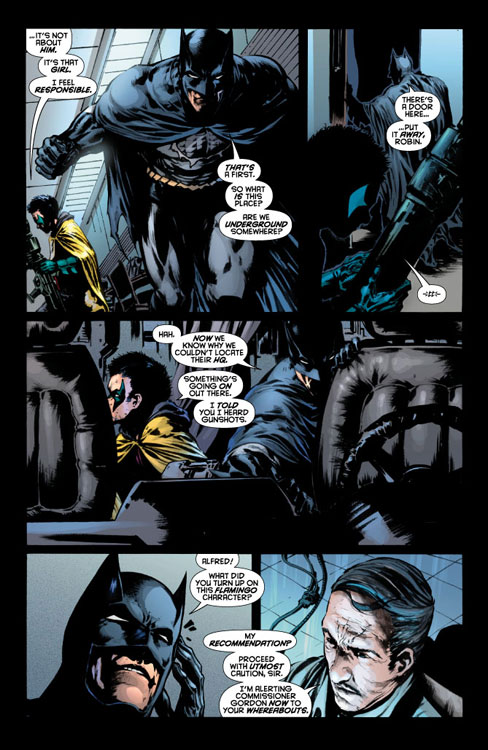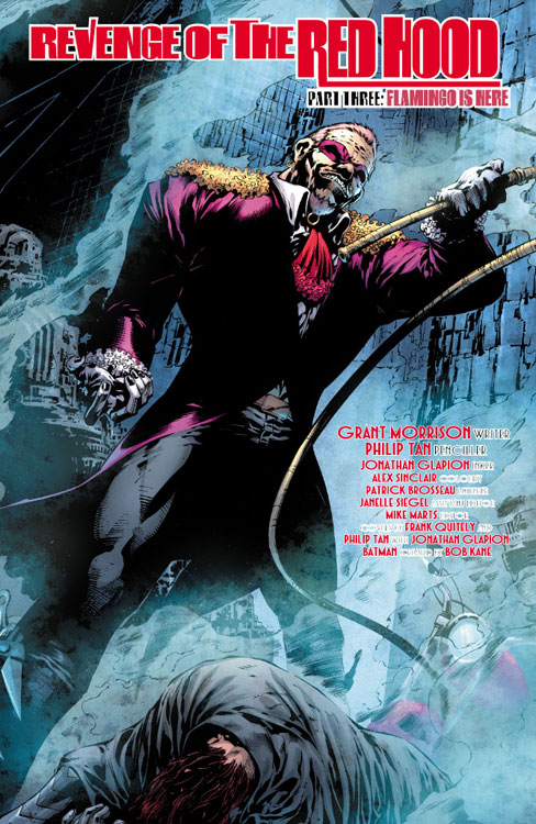 He tugs and tugs at her mask's seams before she gashes him with one of her blades. Feeling responsible for the girl and her condition, Damian jumps into the fray to help but receives four bullets to his cape-protected spine for his troubles, paralyzing him from the waist down. Dick delivers a much-deserved boot to Flamingo's face but it's ultimately Jason Todd who finishes things up. When Dick is nearly tossed over the side of the building, Jason uses a construction digger to scoop Flamingo up along with other assorted rocks and debris and deposit him over the edge plummeting to the Earth below!