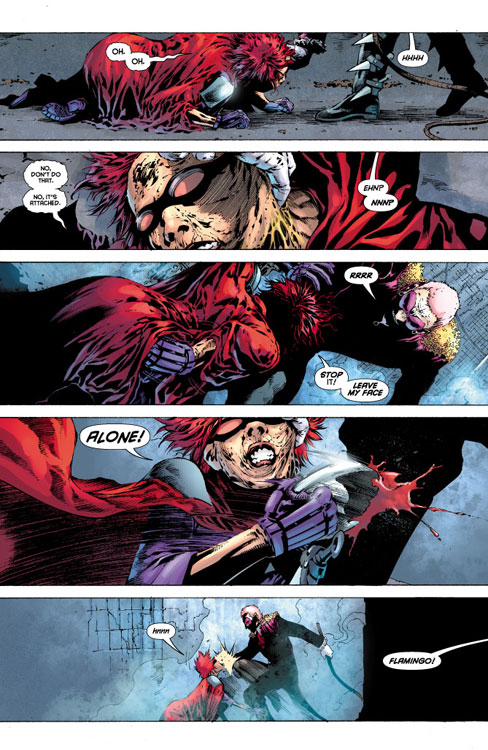 themselves only to find that the situation outside isn't much better. Jason has rallied a defense against the Flamingo but wound up with a bullet wound to the face and knee-cap. The pink-haired hitman then turns his attentions to Red Hood's partner Scarlet. But what happens when the face eating psychopath meets the girl whose face cannot be removed?