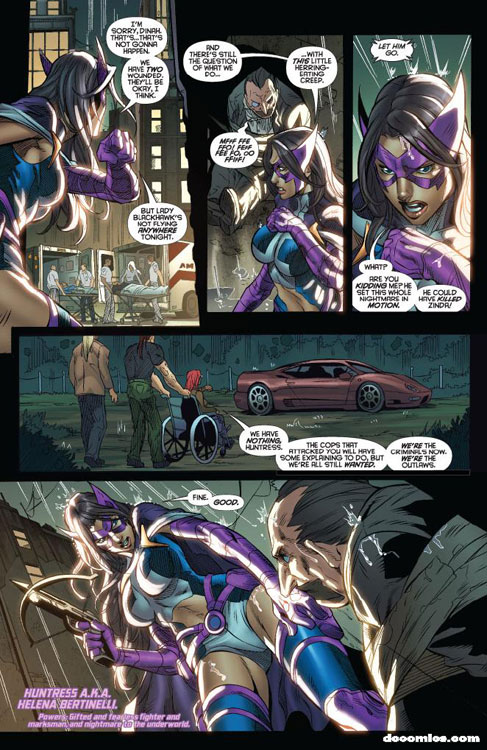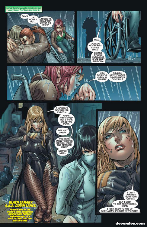 CHARACTERS: Oracle (Barbara Gordon); Black Canary (Dinah Laurel Lance); Huntress (Helena Bertinelli); Lady Blackhawk (Zinda Blake); Hawk (Hank Hall); Dove (Dawn Granger)