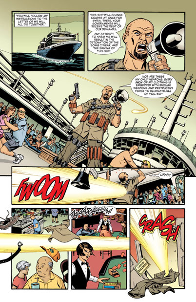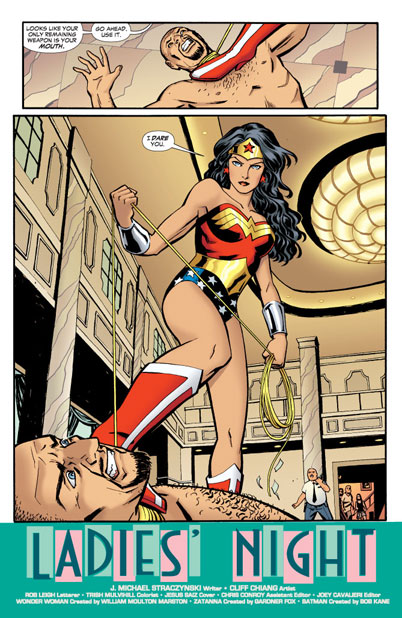 Oh yes, it’s ladies’ night! Batgirl, Wonder Woman and Zatanna enjoy a nice, peaceful evening on the town that absolutely won’t be interrupted by any kind of superheroic hijinks whatsoever... and if you believe that, there’s a giant bronze globe in Metropolis we’d like to sell you!