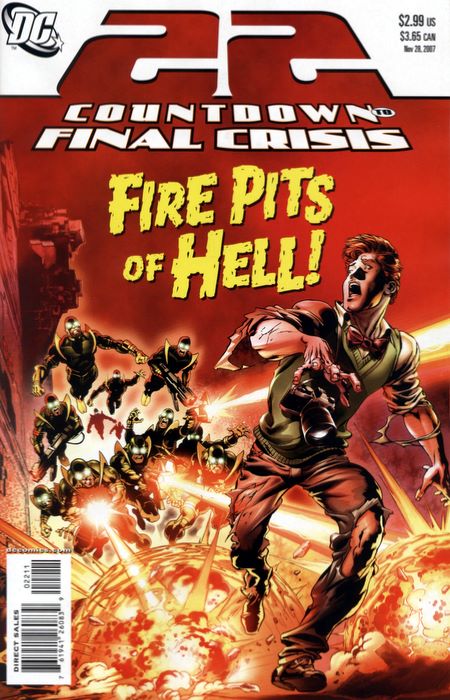 Jimmy Olsen is working with other slaves on Apokolips, throwing dead slaves into the fire pits. A soldier attacks Jimmy for daydreaming and threatens to hurt him worse that night. A stranger dressed in rags catches Jimmy's eye and, when Jimmy investigates, finds out the stranger is Mister Miracle. Jimmy knows that Barda, Miracle's wife, has been killed but doesn't know how he has that knowledge. Miracle was using a Mother Box to track down Barda's soul. The box led him to this place on Apokolips but Mr. Miracle can find no trace of her. The Mother Box tells Mr. Miracle that Jimmy's powers only occur when his life is in danger. To activate them Miracle takes Jimmy into the air and then drops him over one of the fire pits.