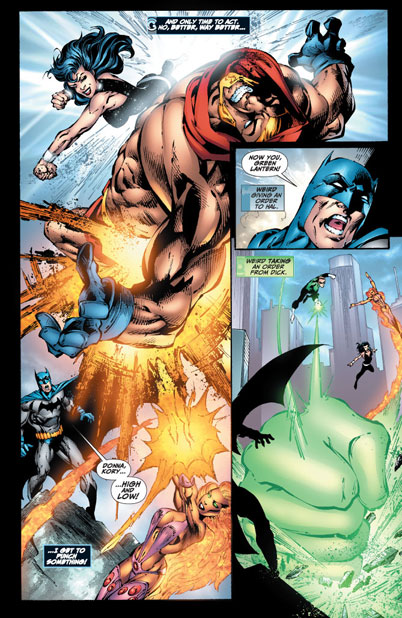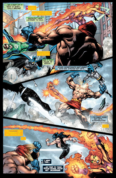 Batman (Dick Grayson); Robin (Damian Wayne); Vixen (Mari McCabe); Red Tornado (John Smith); Zatanna; Mon-El; Donna Troy; Wonder Woman (Diana Prince); Darwin Jones; Starfire (Koriand'r); Cyborg (Vic Stone); Dr. Impossible; Green Lantern (Hal Jordan); Atom (Ray Palmer); Green Arrow (Oliver Queen); Dr. Light (Kimiyo Hoshi); Starfire (Koriand'r); Guardian (Jim Harper)Atom (Ray Palmer); Congorilla