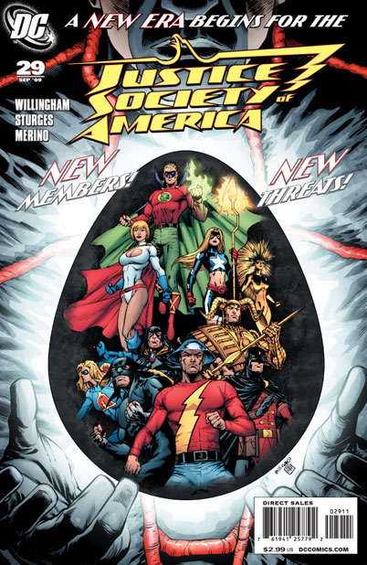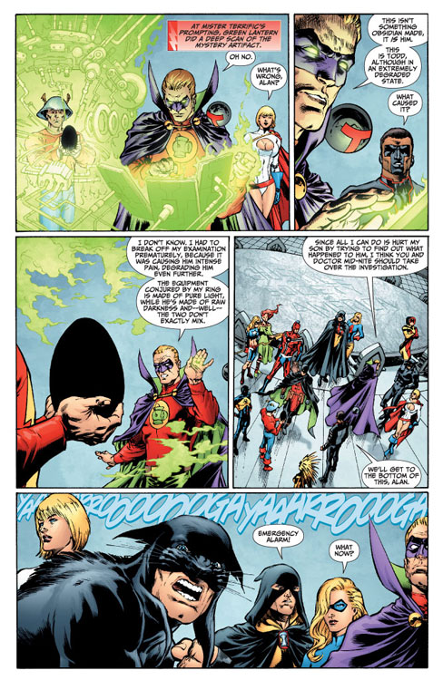 Back at the Brownstone, Mr. Terrific is still terribly puzzled by the enigmatic egg. After running a diagnostic on it he decides to wait until Dr. Mid-Nite returns before performing any other tasks. When from out of nowhere, the All American Kid walks into the room with a knife! As if under some kind of mind control, eyes glowing red, he stabs Mr.