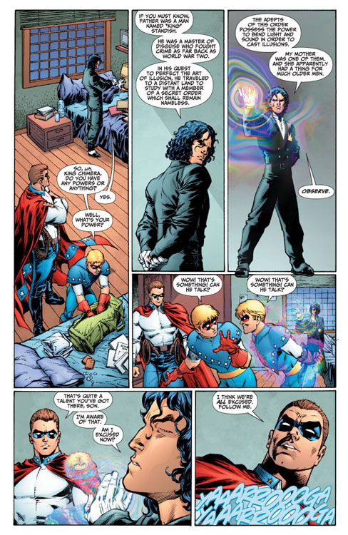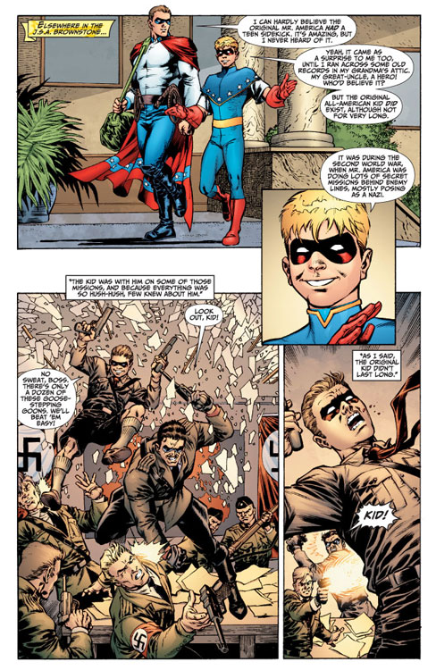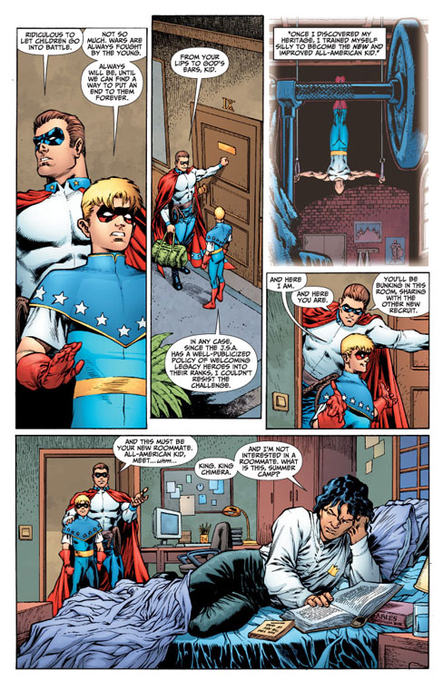 After finding out that he was actually the great-nephew of the original All American Kid (the oft-overlooked WW2 sidekick to the original Mr. America), this particularly industrious young boy set out to train himself so that he could assume the mantle. After arduous physical training, the Kid met up with the current Mr. America (Jeffrey Graves) and together they sought out the JSA to help train the boy further and turn him into a genuine hero. Given the JSA's reputation for training and readying young legacy heroes, this seemed like the perfect fit.