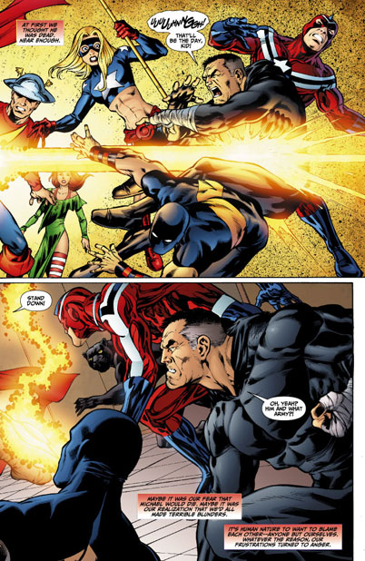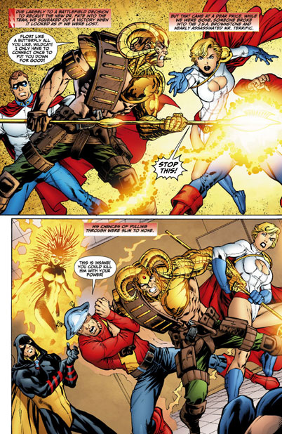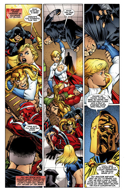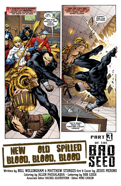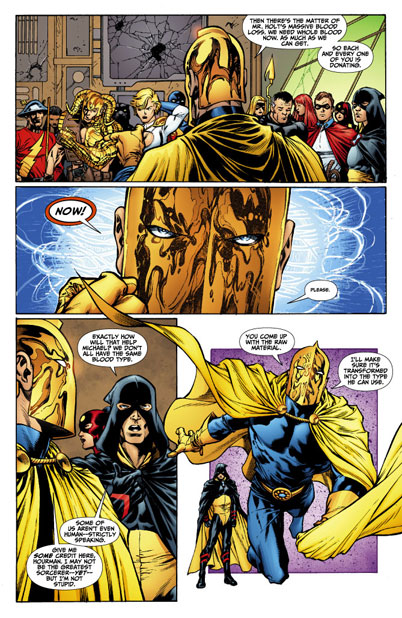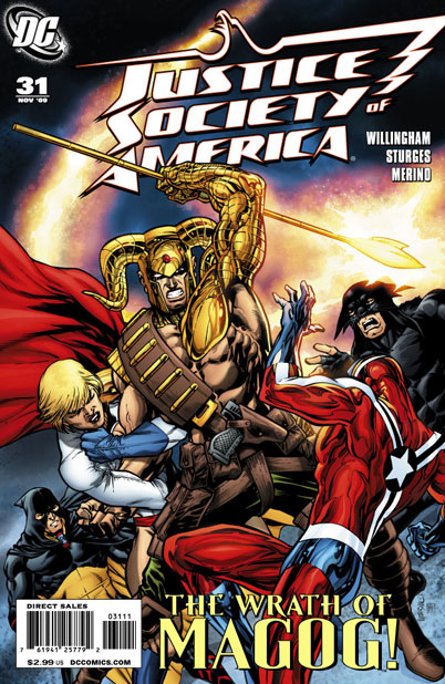 equipment. No one can believe Billy Armstrong was capable of stabbing Mr. Terrific over a dozen or so times (not even Billy Armstrong). Yet the shocking revelation only serves to solidify Magog's stubborn opinion - the JSA's techniques are out of date, especially where recruitment methods are concerned. Black Adam? Alex Montez? Now the All American Kid! How many more psychopaths and murderers are they going to allow to join their ranks just because they happen to sport a legacy title before they learn their lesson?