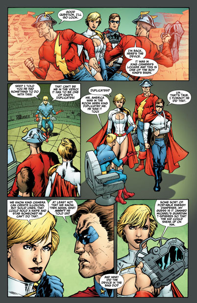 King (who claims to have no other name) is offended at the mere implication of him having anything to do with such a heinous act. So much so that he refuses to sit for questioning and, using his powers to open the locked doors, excuses himself from the interrogation room. Both Liberty Belle and Power Girl go after Chimera but his powers of illusion allow him to escape their grasp. It isn't until Kara decides to implement some good old fashioned super-breath that the magician is knocked off his game and sent flying. Unfortunately at just that moment a giant explosion destroys the entire room's wall! The Brownstone is under attack!