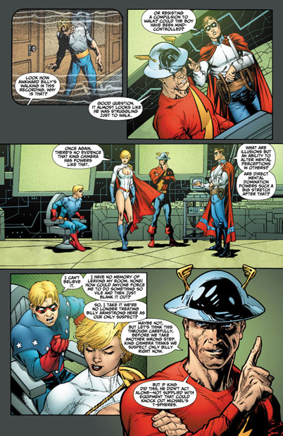 Meanwhile, the investigation continues into Mr. Terrific's murder. They know that Billy Armstrong was the one who disabled Terrific's protective T-Spheres and stabbed him, but did he do so under his own volition? Or was he being manipulated by someone else? Perhaps someone with powers of illusion like fellow new recruit King Chimera?
