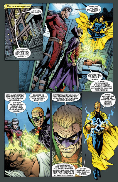 Michael Holt's heart may have stopped beating, but thanks to Alan Scott's powerful green ring his body has been kept in stasis ever since. It may have been hours since his death was pronounced but inside Green Lantern's protective aura only seconds have passed. There still may be time to revive him if Dr. Fate's spell is powerful enough to shock the body back to life. The only question is whether or not the