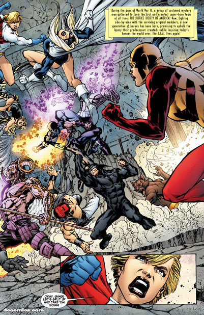 Green Lantern (Alan Scott); Flash (Jay Garrick); Doctor Fate (Kent V. Nelson); Wildcat (Ted Grant); Stargirl (Courtney Whitmore); Magog (Lance Corporal David Reid); Power Girl (Karen Starr); Mr. Terrific (Michael Holt); Liberty Belle (Jesse Chambers); Hourman (Rick Tyler); Damage (Grant Emerson); Dr. Mid-Nite (Pieter Cross); Cyclone (Maxine Hunkel); Wildcat (Tom Bronson); Judomaster (Sonia Sato); Citizen Steel (Nate Heywood); Obsidian (Todd Rice); Mr. America (Jeffrey Graves); All-American Kid (Billy Armstrong); Lightning (Jennifer Pierce); King Chimera; Tapeworm; Eclipso (Bruce Gordon); Blue Moon; Tiger Moth; Doctor Polaris (John Nichol); Homunculus; Underhand; Icicle (Cameron Mahkent);