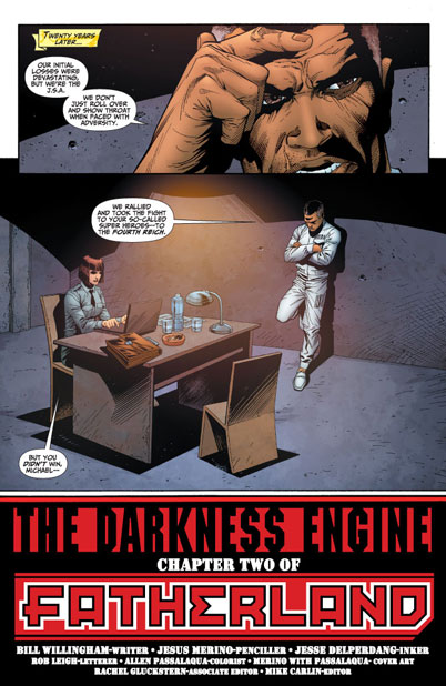 The war takes a turn for the worse for the JSA as the enemy fires up their super power-negating “Darkness Engine.” But the terror rises when the team learns that the machine is powered by the black egg that used to be their colleague Obsidian!