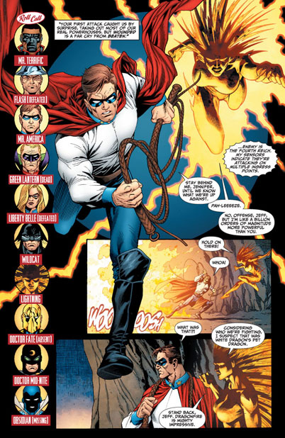 CHARACTERS: Green Lantern (Alan Scott); Flash (Jay Garrick); Wildcat (Ted Grant); Mr. Terrific (Michael Holt); Power Girl (Karen Starr); Liberty Belle (Jesse Chambers); Dr. Mid-Nite (Pieter Cross); Amazing-Man (Markus Clay); Doctor Fate (Kent V. Nelson); Mr. America (Jeffrey Graves)