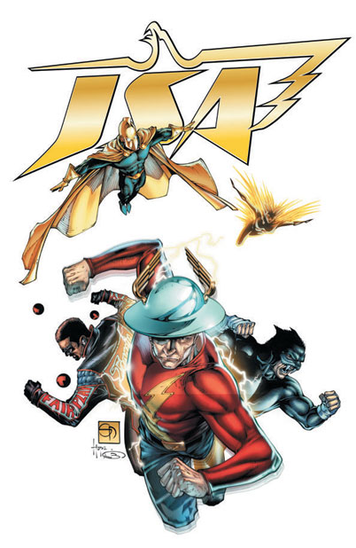CHARACTERS: Green Lantern (Alan Scott); Flash (Jay Garrick); Wildcat (Ted Grant); Mr. Terrific (Michael Holt); Power Girl (Karen Starr); Liberty Belle (Jesse Chambers); Dr. Mid-Nite (Pieter Cross); Amazing-Man (Markus Clay); Doctor Fate (Kent V. Nelson); Mr. America (Jeffrey Graves); Blue Devil (Daniel Cassidy)
