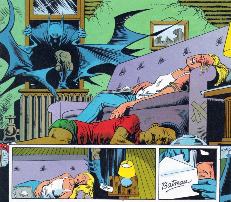 Back in costume, the Black Spider makes his way into a broken window and pries open floor boards, revealing a surplus of various weapons. He then makes his way back to the apartment with the weapons to find both Linda and Mikey dead. He sees the needle in Linda's arm and presumes the sugar on his son's cereal was heroin. As a teary eyed Black Spider begins writing his letter, Batman is in the Batcave discovering the whereabouts of Black Spider's son. With his assortment of weapons, Black Spider leaves the window only moments before Batman arrives to recreate the opening scene of the story.