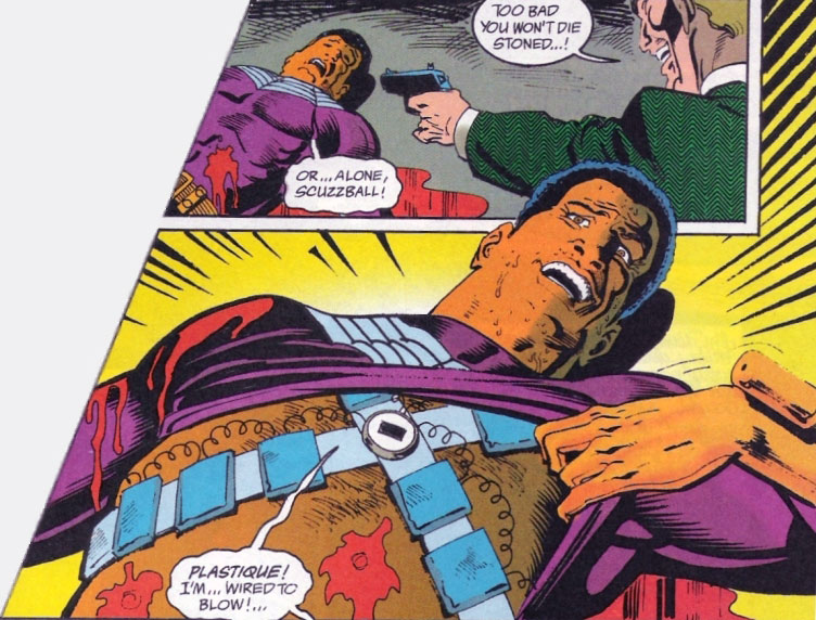 Back at Linda's apartment, a street clothed Eric Needham is lecturing her about the toll that drugs are taking on her and their son, Mikey. The boyt becomes angered and shouts at Eric, silencing him. Linda then forces Eric to take his costume and leave. Just as Eric exits the apartment building, a dealer waiting outside makes his entrance.