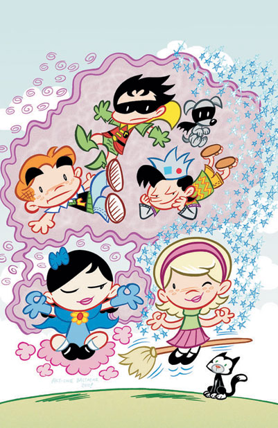 The crossover event of the millennium takes a turn for the magical as Sabrina the Witch and Raven take center stage, causing everything in the world of the Tiny Titans and Little Archie to get mixed up more than ever! And Veronica finally brings the other little kid with an "R" on his shirt home to meet her father. Can Robin's utility belt help him in this kind of situation? And who is responsible for that mess in the Batcave? Archie can't blame the penguins this time!