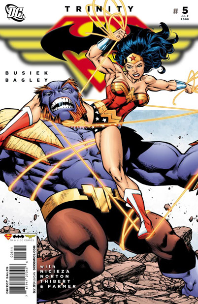 Superman returns with a gas that would place Konvikt in cryosleep. When he sprays him, Konvikt holds his breath. Wonder Woman deals with this by knocking the wind out of him. Konvikt is finally down and out. Batman shows up with another alien tied up, the one that burned a mark on Wonder Woman's shoulder. The alien turns out to actually be one of Morgaine's minions. She is shocked that Batman was able to track him while Enigma simply laughs at this. The minion begins telling them that they are the Trinity but are weakened. Before it can fully inform them of his mistress' plans, he bursts into flames. Konvikt is then transported to the Slab.
