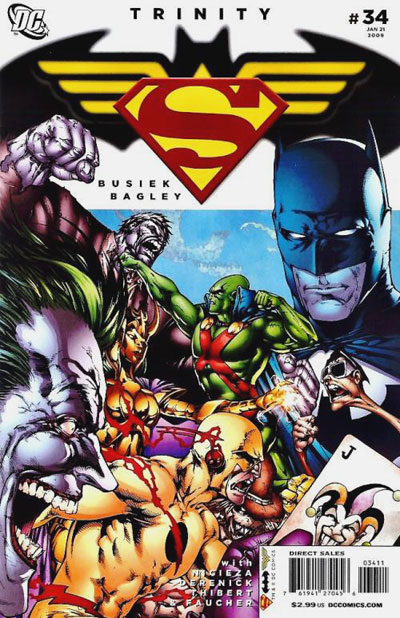 The Justice Society links together members in an effort to shut down more of the Troika’s henchmen. Led by Hawkman, heroes including Hawkgirl, Plastic Man, Firestorm and Gangbuster struggle to defeat Dr. Light, Punch and Jewelee, Catman, Catwoman and others, led by Vandal Savage. The heroes make a desperate play, killing Dr. Light in an attempt to shut down the city’s transformation, only to learn he was an unimportant player and that Vandal is the key to the Troika’s victory. Disheartened, the Society flees the ravaged city, but Gangbuster reminds everyone of the most important fact: many of the civilians were saved by the intervention of the heroes.