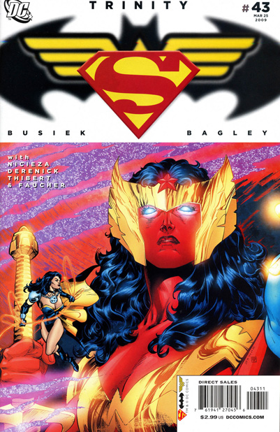 The Companions recover from their return and the arrival of the Trinity back on Earth. Supergirl joins the League and the Society in Europe, while Lois Lane tries to return to work at the Daily Planet. Elsewhere, Nemesis gets grilled by Sarge Steel, while Alfred and Nightwing maintain communications with the secret agent and Donna Troy. In the end, the heroes decide they need to find a way to contact the Trinity, though Lois takes the most extreme route and leaps from the roof of the Planet’s building, only to be saved by Tomorrow Woman, still somehow surviving in this reality. Taking off to Europe, the Companions then are confronted by the nigh-powerful Trinity, who announce their intent to reshape the world as gods.