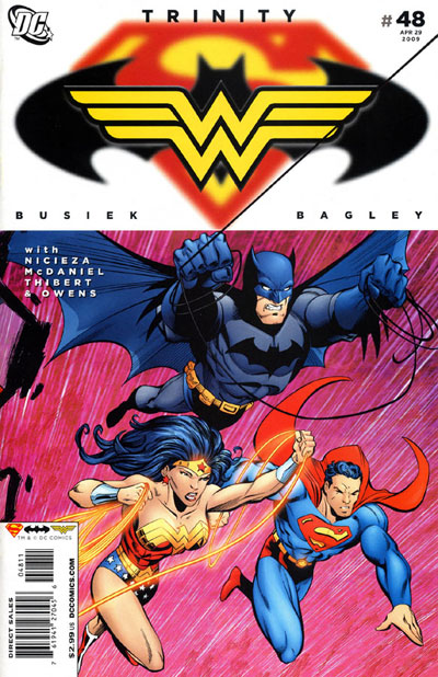 Batman (Bruce Wayne); Superman (Clark Kent); Wonder Woman (Diana Prince); Alfred Pennyworth; Nightwing (Dick Grayson); Lois Lane; Donna Troy; Superirl (Linda Lang); Firestorm (Jason Rusch); Kanjar Ro; Krona; Tarot (Marguerita Arroyo Covas); Charity O'Dare; Gangbuster (Jose Delgado); Despero; Morgaine Le Fey; Enigma (Edward Nashton); Ultraman; Owlman; Superwoman; Power Ring; Johnny Quick; Konvikt; Primat; The Trans-Volitional Man; Swashbuckler; Sun-Chained-In-Ink; Void Hound