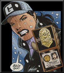 How about Gotham City police officer Renee Montoya? Fans of the exemplary BATMAN ANIMATED SERIES will recall Montoya as the lovely Latino lady partnered with cantankerous detective Harvey Bullock. The character also appears in recent DC Comics, but with a delicious twist of lesbian, hey!