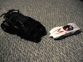 If it was a perfectly smooth road, the Mach 5 might give ol' Bats a run...but then race is over as soon as they get to the obstacle course Smile