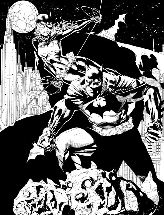Wow. I am in awe. You are a fine artist, I'd say I like this Batman even better than Jim Lee's, he's a little thiner and more realistic. I love the Batgirl, who happens to be one of my favorite characters. Though the Batarang doesn't look that arrow dynamic and the moon is a little to cratered, but I'm just to impressed by the characters, the gargoyles and the skyline to really care.