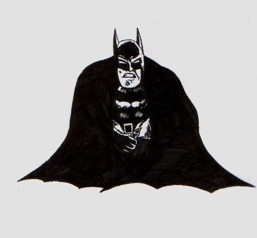 It's cool; I like the shape of the eyes and the shading on the cowl. The muscle shading looks great. I kind of think that the mouth is a little high on his face and that the hand's a little funky lookin. All in all, great work man.