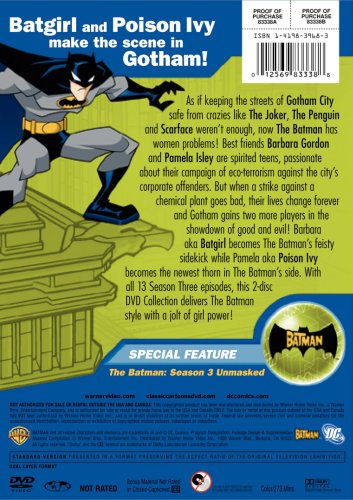 As if keeping the streets of Gotham City safe from crazies like The Joker, The Penguin and Scarface weren't enough, now The Batman has women problems! Best friends Barbara Gordon and Pamela Isley are spirited teens, passionate about their campaign of eco-terrorisms against the city's corporate offenders. But when a strike against a chemical plant goes bad, their lives change forever and Gotham gains two more players in the showdown of good and evil! Barbara aka Batgirl becomes The Batman's feisty sidekick while Pamela aka Poison Ivy becomes the newest thorn in The Batman's side. With all 13 Season Three episodes, this 2-disc DVD collection delivers The Batman style with a jolt of girl power!