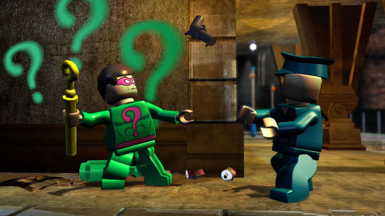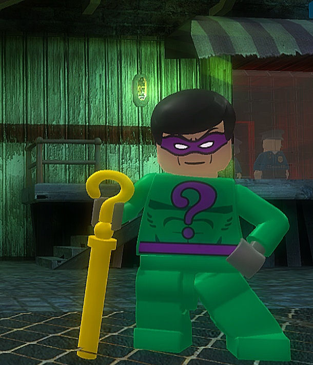 • Two-Face- The fourth character who is seen the most with the Riddler. This pays a homage to Batman Forever as he was seen with the Riddler. He helps by stealing a special weapon, driving him away, being a boss twice, and doing a level involving the car chase. Unlike most characters he is immune to toxins. In prison he is seen flipping a coin.