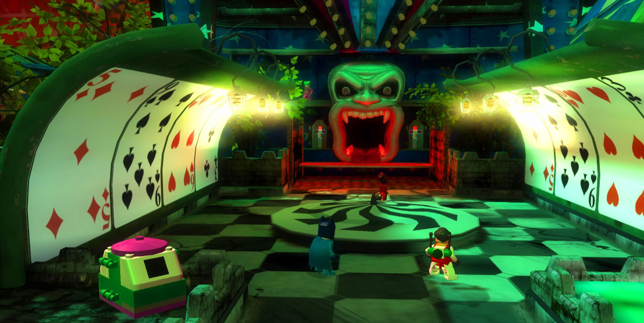 There are thirty levels in the game (fifteen for the heroes and fifteen for the villains) as well as some secret levels, including Wayne Manor and Arkham Asylum. There are many different environments in the game, usually based upon the villains' crime styles, including an ice cream factory, a garden center, the Gotham sewers, and Gotham's seedy underbelly. The game is divided into chapters, each containing five levels. Chapters are divided equally between heroes and villains. Completing a hero chapter will unlock the corresponding chapter for the villains. As in previous Lego games, levels are unlocked for "Free Play" mode once they are completed in Story Mode. "Free Play" allows the player to replay any level they have completed, but with any characters they have unlocked so far. This permits access to special areas containing additional collectables, where the player was unable to get to before. This is unlike Story mode, in which the player may only switch between the two characters involved in that scene.