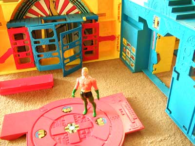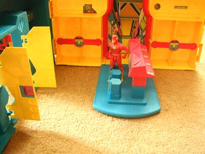 Hall of Justice featured jail cells with hidden trap doors, working elevator and security doors, "revitalization chambers" (figure storage compartments), computer command center, and vehicle landing pad. With a triple section design that folded out for play or compacted for a carrying case