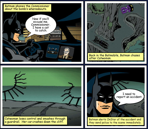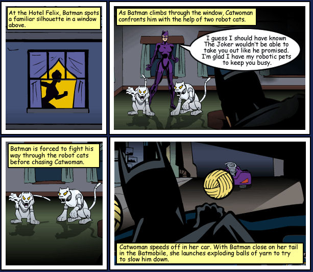 Not Long after captureing The Joker, Batman learns that Catwoman is out of prison. Batman Tracks her down using Onstar and the chase is on. Batman Learns that Two-Face and Catwoman are working together.