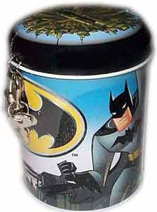 A 14" tall talking Batman bank! His mouth moves as he says three different movie phrases. He also features light-up eyes, chest emblem and ice platform and has an actual blowing cape!