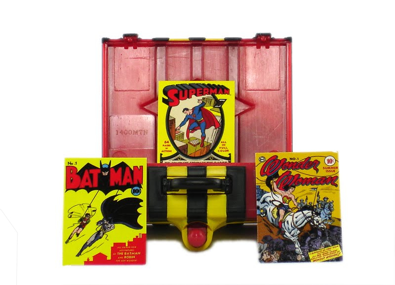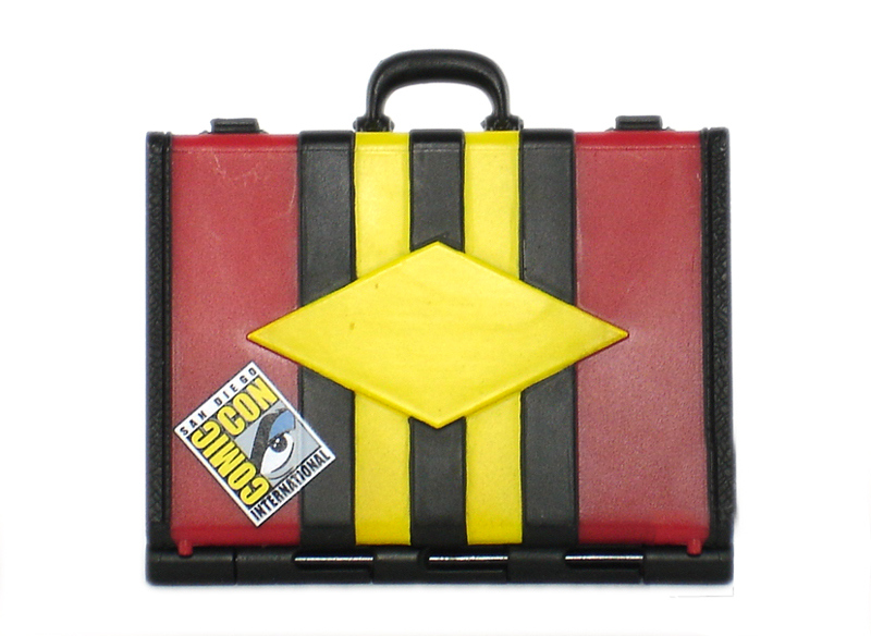 The Plastic Man Suitcase is packed in a poly bag and comes free when you purchase DCU Plastic Man at SDCC (available only while supplies last). You can attach his arms, head, and neck to the suitcase as if he has disguised himself as a suitcase. Open up the suitcase and find chip art comic book covers from the 75 years of DC Comics!
