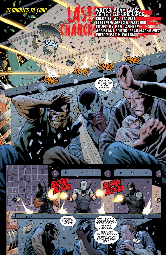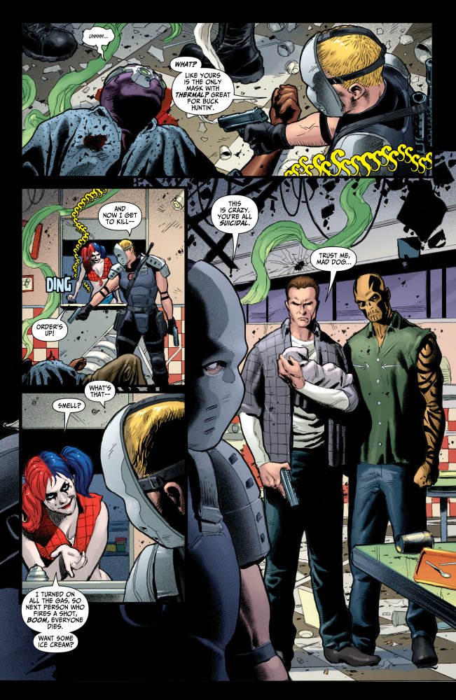 After last issue's harrowing mission, the covert Squad must "disappear" until Task Force X can safely (and secretly) extract them from the field. Can a team of super villain soldiers maintain a low profile in a small town? Plus, another Squad member bites the dust – and King Shark eats a guy.