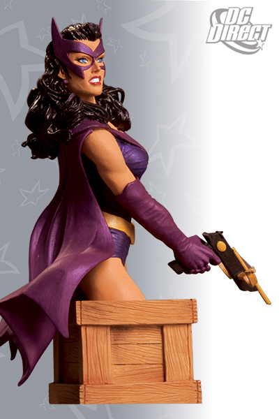 The popular WOMEN OF THE DC UNIVERSE line of cold-cast porcelain busts continues with the Huntress! As a Bird of Prey and uneasy ally of Batman, the Huntress is a nocturnal mistress of vengeance. Perched atop a GOTHAM CITY shipyard crate, her crossbow drawn, this crimefighter is prepared for whatever trouble lurks in the shadows of night.