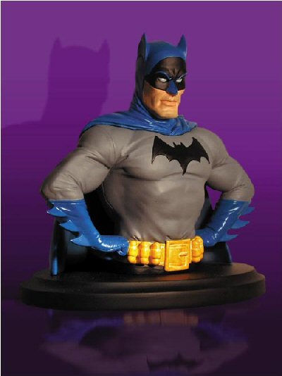 DC Direct Batman is the masked crusader who uses his strength, intellect and an array of high-tech inventions to fight the sinister forces that threaten Gotham City. This hand-painted cold-cast porcelain bust measures approximately 6.25" high x 3.5" wide x 3.5" deep and is packaged in a 4-color box.