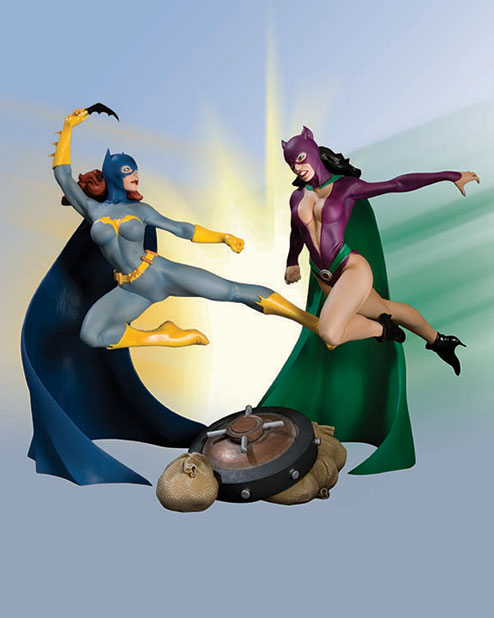 The latest addition to this line of statues sculpted by some of DC Direct's premier talent features Batgirl confronting Catwoman as the feline fatale attempts to pull a bank heist. In a unique twist, not only does each figure's cape suspend her in mid-air, but the capes act as bases on which the figures stand. Packaged as three separate pieces (Batgirl, Catwoman and the bank vault over which they are fighting), the statue can be set up in a variety of configurations. The Catwoman Vs. Batgirl Statue is limited-edition, hand-painted and cold-cast in porcelain.