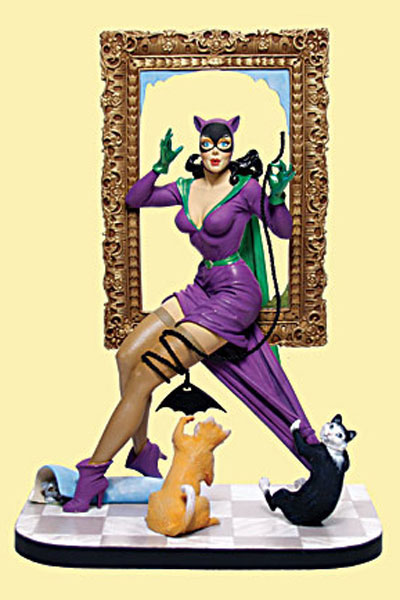 DESIGNER & SCULPTOR: Tim Bruckner A new line of statues from DC Direct begins! Catwoman has been sexy in every era, from her debut in 1940 to today. This beautiful statue captures the Golden Age Catwoman in a classic "pin-up" pose. This first in a series of limited-edition, hand-painted cold-cast porcelain statues measures approximately 7.375" tall x 6" wide x 4.375" deep, includes a full-color Certificate of Authenticity and is packaged in a 4-color box.