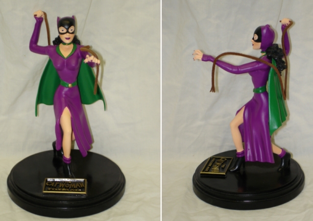 The CATWOMAN PVC STATUE a limited-edition, hand-painted PVC statue is 9" tall. This limited edition non-articulate plastic display figure comes with a base and is packaged in a 4-color window box with J-hook and is manufactured to order.
