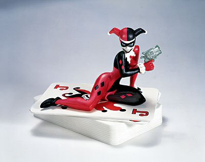 Based on the original, sold-out Harley Quinn statue designed by Bruce Timm! Sitting on a deck of cards and holding her trademark popgun, no one can resist the devilishly lovely Harley Quinn. This mini statue is a fully sculpted, hand-painted, cold-cast porcelain statue measuring approximately 2.63" high x 3.5" wide x 2.25" deep. Packaged in a 4-color box.