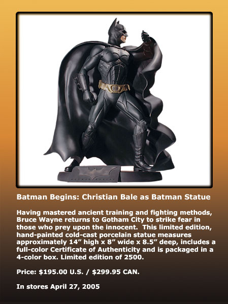 DC Direct All Batman Begins mini-statues can be displayed together to create dramatic fight scenes. Batman becomes an avenger of the night, in a never-ending battle against Gotham City's most fearsome criminals. This hand-painted cold-cast porcelain mini-statue measures approximately 4" high x 2.75" wide x 2.75" deep and is packaged in a 4-color box.