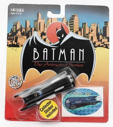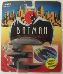 Ertl The 1/64 scale Batplane, including a Collector Sticker. Released in silver emblem and yellow emblem variations. CARD BACKSIDE ERROR CARD